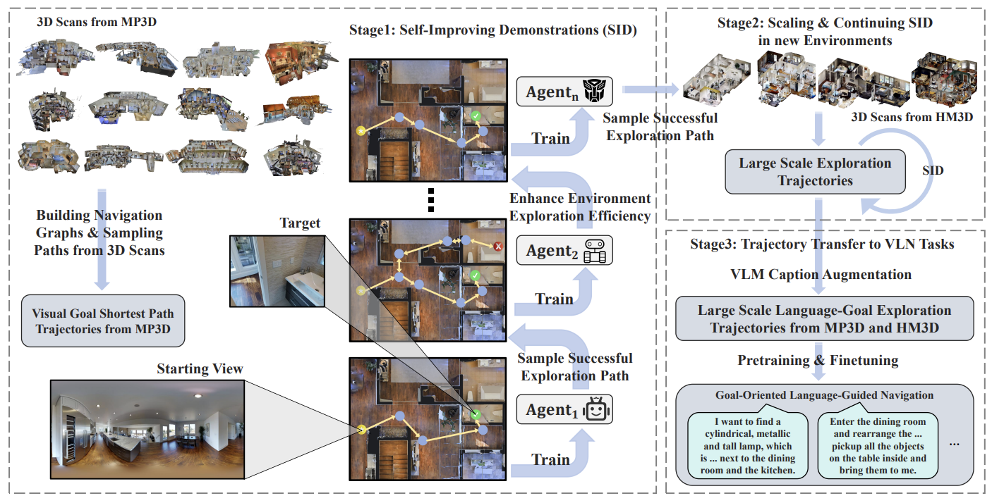 Learning Goal-Oriented Language-Guided Navigation with Self-Improving Demonstrations at Scale